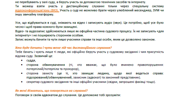 Download Check-list - parents - u_0.pdf269.02 КБ Children - Q&A - upd.pdf446.05 КБ Якщо тобі 14-17 років і ти є учасником кримінального процесу – ця пам’ятка для тебе.Тут зібрані основні питання та відповіді, які допоможуть підготуватись до дистанційних слухань. Дата публікації 09 кві 2026